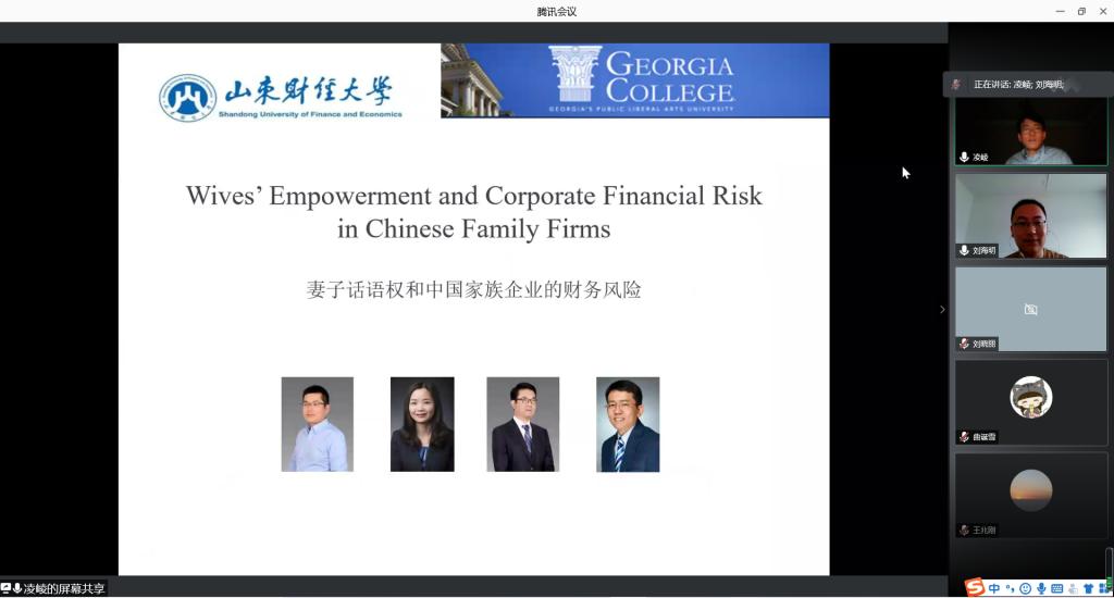 (通讯员:刘海明、曲诞雪)5月13日上午,由山东财经大学金融学院、山东省金融产业优化与区域管理协同创新中心、山东财经大学金融国际研究中心联合举办的第22期“泰山金融学术训练营”通过腾讯会议举行,美国Georgia College & State University金融学终身教授凌崚老师应邀做客本次学术训练营,为师生们带来了题为“Wives’ Empowerment and Corporate Financial Risk in Chinese Family Firms”的讲座,学术训练营由金融工程系刘海明教授主持,学院部分教师和研究生参加了本次活动。