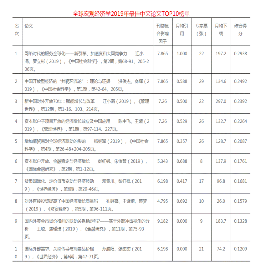 近日,《世界经济年鉴》期刊公布了世界经济学2019年最佳论文TOP10榜单。金融国际研究中心主任彭红枫教授与清华大学五道口金融学院朱怡哲博士合作发表于《国际金融研究》2019年第2期的文章《资本账户开放、金融稳定与经济增长》、与中山大学国际金融学院邓贵川博士合作发表于《世界经济》2019年第6期的文章《货币国际化、定价货币变动与经济波动》入选“全球宏观经济学2019年最佳中文论文TOP10榜单”。